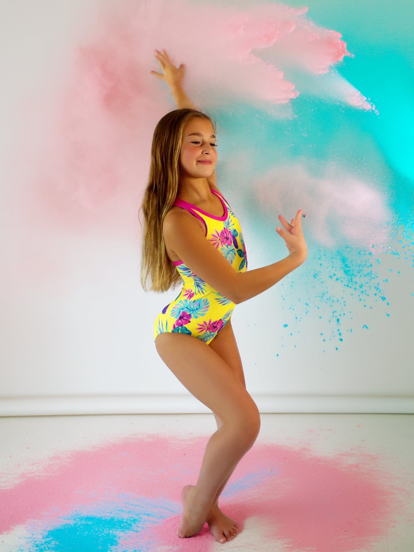 Young girl in a colorful leotard posing against a backdrop of pink and blue powder.  Neon yellow with hibiscus flowers